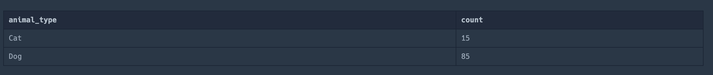 SELECT ANIMAL_TYPE,count(ANIMAL_TYPE) as count