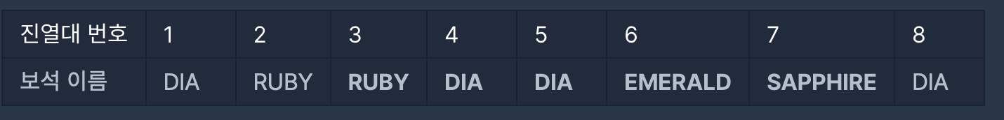 ["DIA", "RUBY", "RUBY", "DIA", "DIA", "EMERALD", "SAPPHIRE", "DIA"] [3, 7]