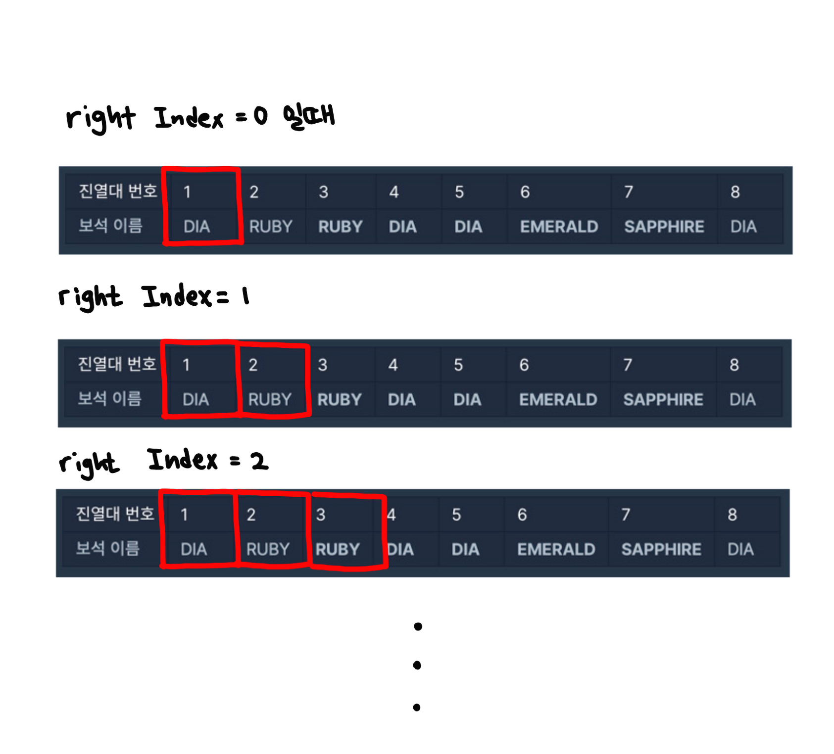 그렇다면 right 인덱스 값이 7이 되었을 때 우리가 원하는 모든 보석을 map 배열에 담았다고 볼 수 있다.